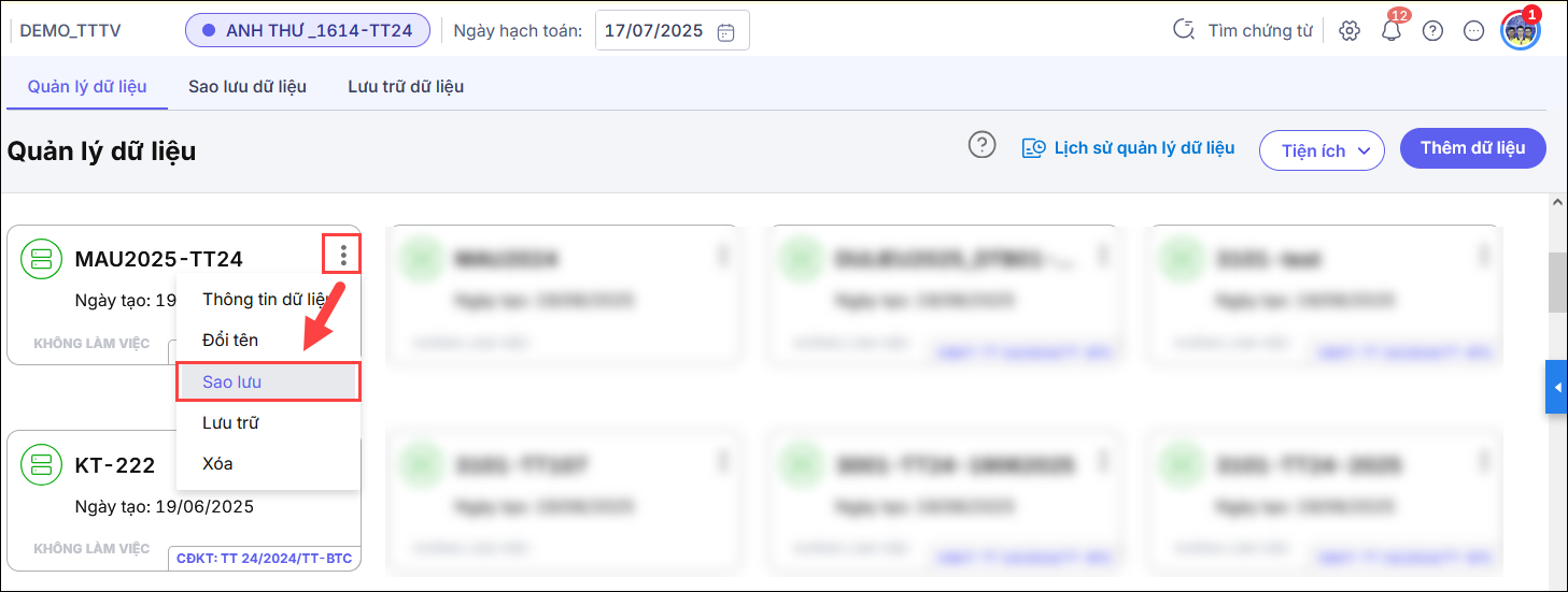 Bước 3: Trên giao diện Quản lý dữ liệu, tại dữ liệu muốn xóa, bạn tích biểu tượng dấu 3 chấm và tích Sao lưu.