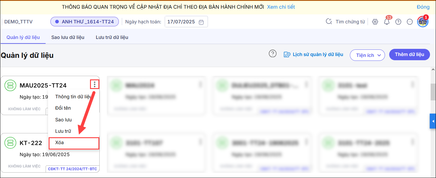 • Nếu dữ liệu này bạn cần xóa bỏ thì tích vào ô Tôi đồng ý và Tích Xóa dữ liệu.