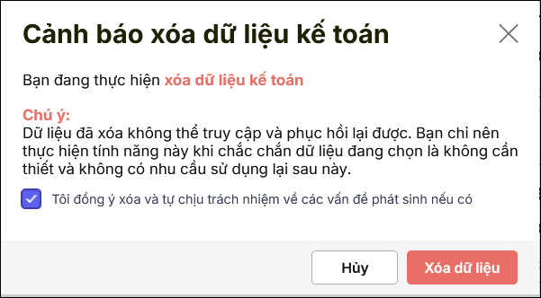 Bước 5: Phần mềm hiển thị giao diện Cảnh báo xóa dữ liệu kế toán.