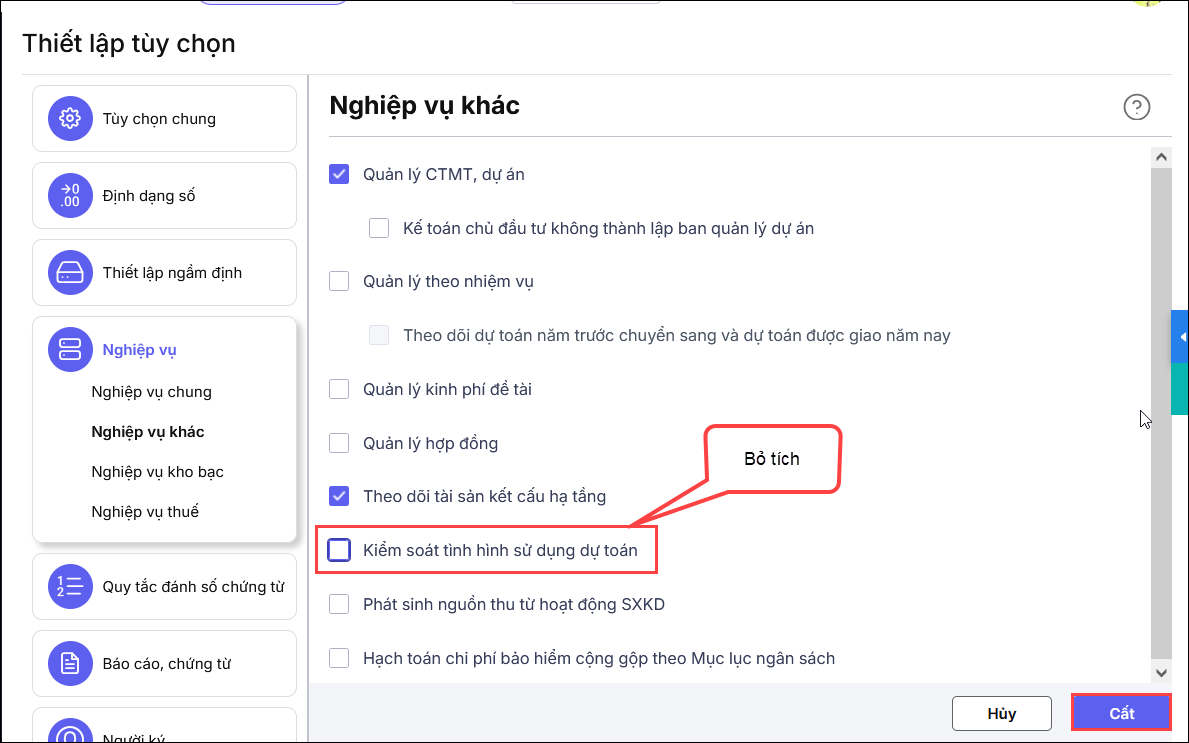 Bước 4: Chọn phần Nghiệp vụ khác, bỏ tích chọn Kiểm soát tình hình sử dụng dự toán.
