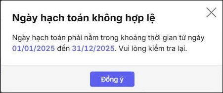 Ví dụ: Ngày hạch toán trên giao diện chính là 31/12/2025 thì khi nhập chứng từ chỉ nhập được những chứng từ có ngày hạch toán từ 01/01/2025 đến ngày 31/12/2025