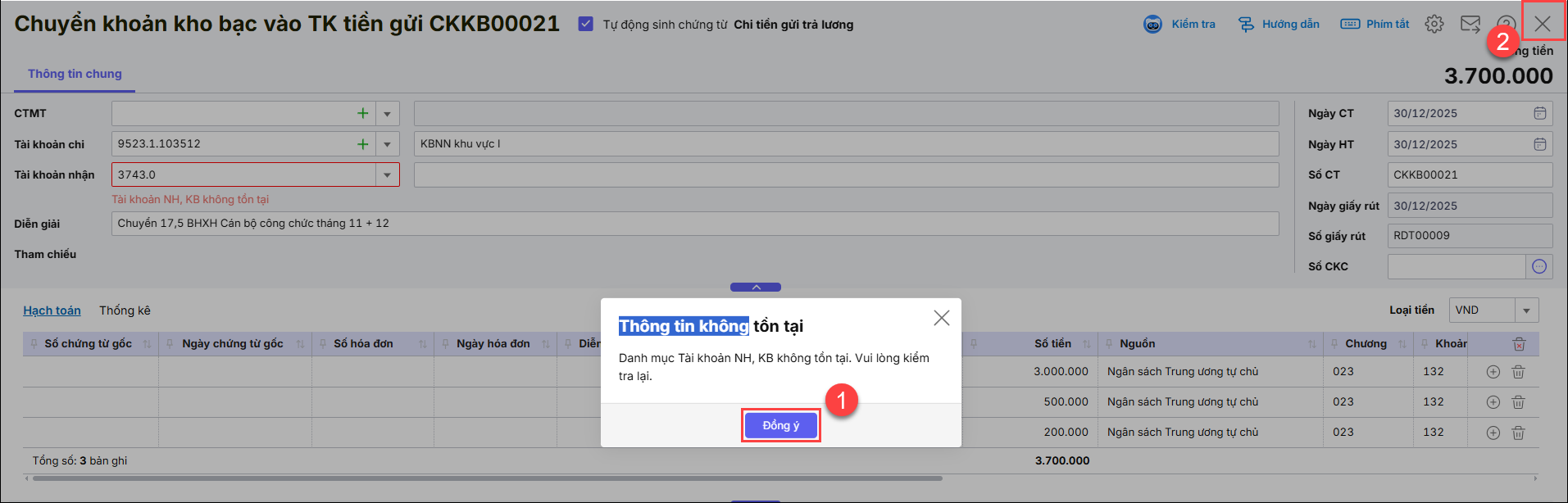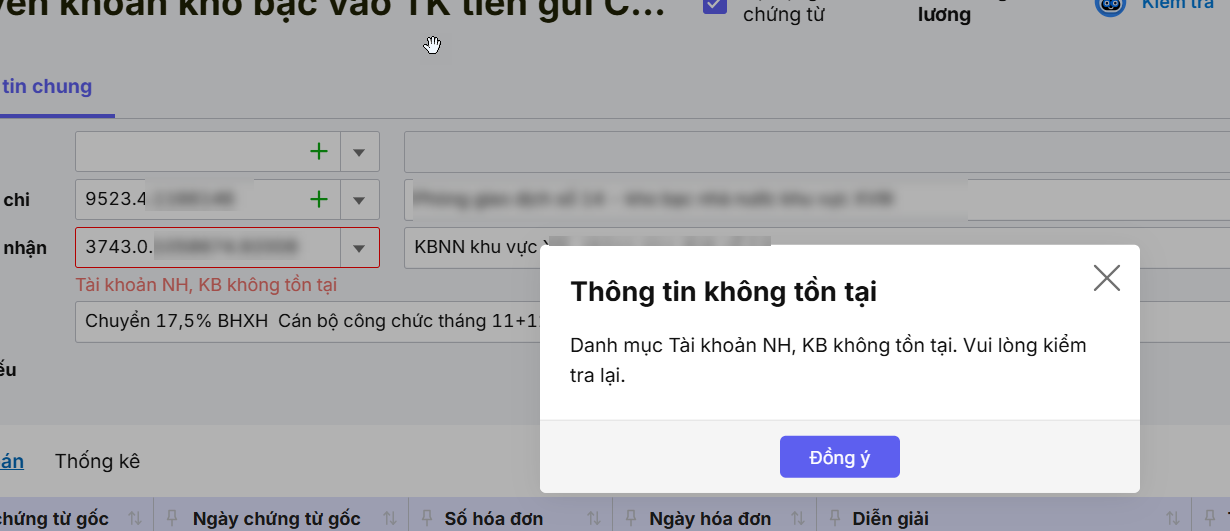 Thông báo này thường gặp khi anh/chị lập chứng từ chuyển khoản bảo hiểm khi cất chọn sinh Chuyển khoản kho bạc vào tài khoản tiền gửi