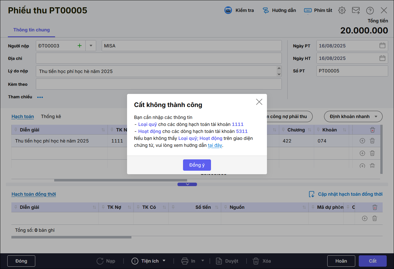 4. Làm thế nào khi cất phiếu thu phần mềm báo lỗi: “Lỗi ghi chứng từ vào sổ cái: thiếu Loại quỹ, Hoạt động, Ghi sổ không thành công”?