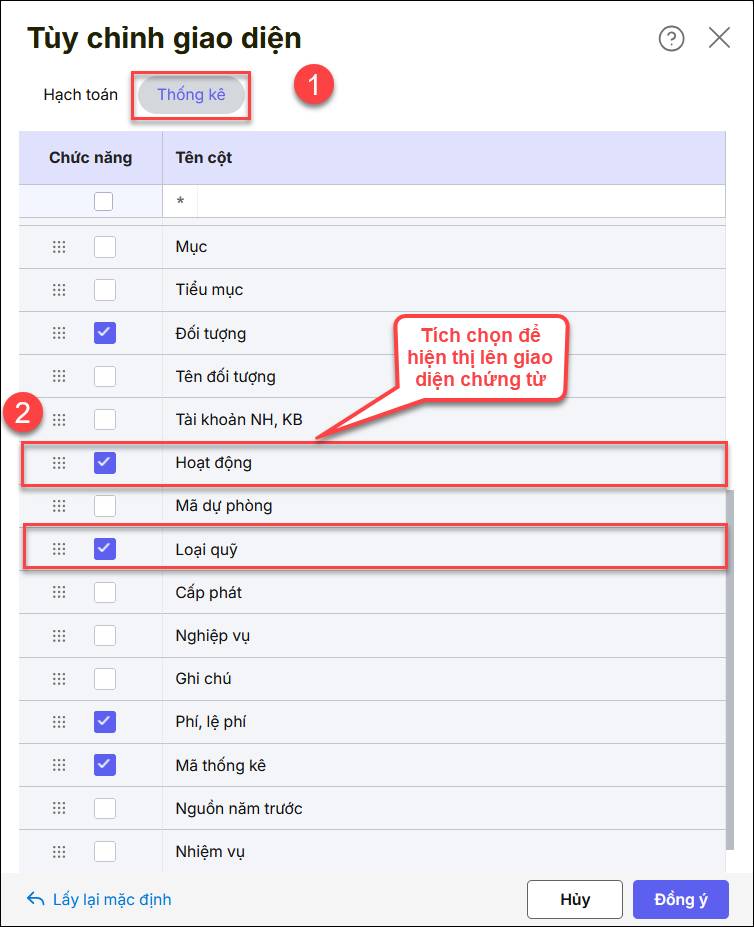 • Tích chọn các cột Loại quỹ, Hoạt động cần hiển thị trên tab chi tiết của chứng từ.