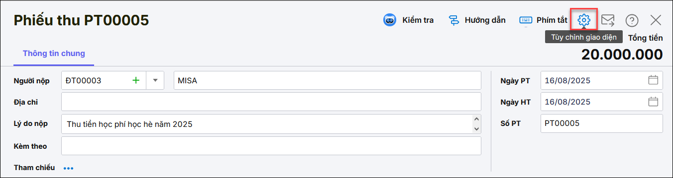 • Trên chứng từ Phiếu thu, nhấn Sửa, chọn qua tab Thống kê, chọn Loại quỹHoạt động tương ứng rồi Cất.