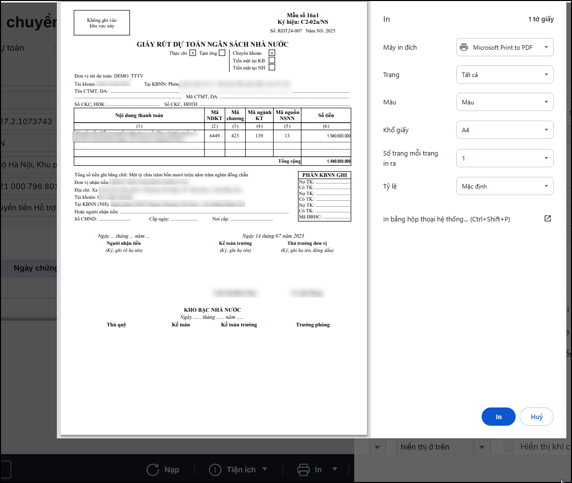 4. Làm thế nào khi không thấy nút xuất khẩu DVC khi in giấy rút dự toán ngân sách hoặc ủy nhiệm chi ?