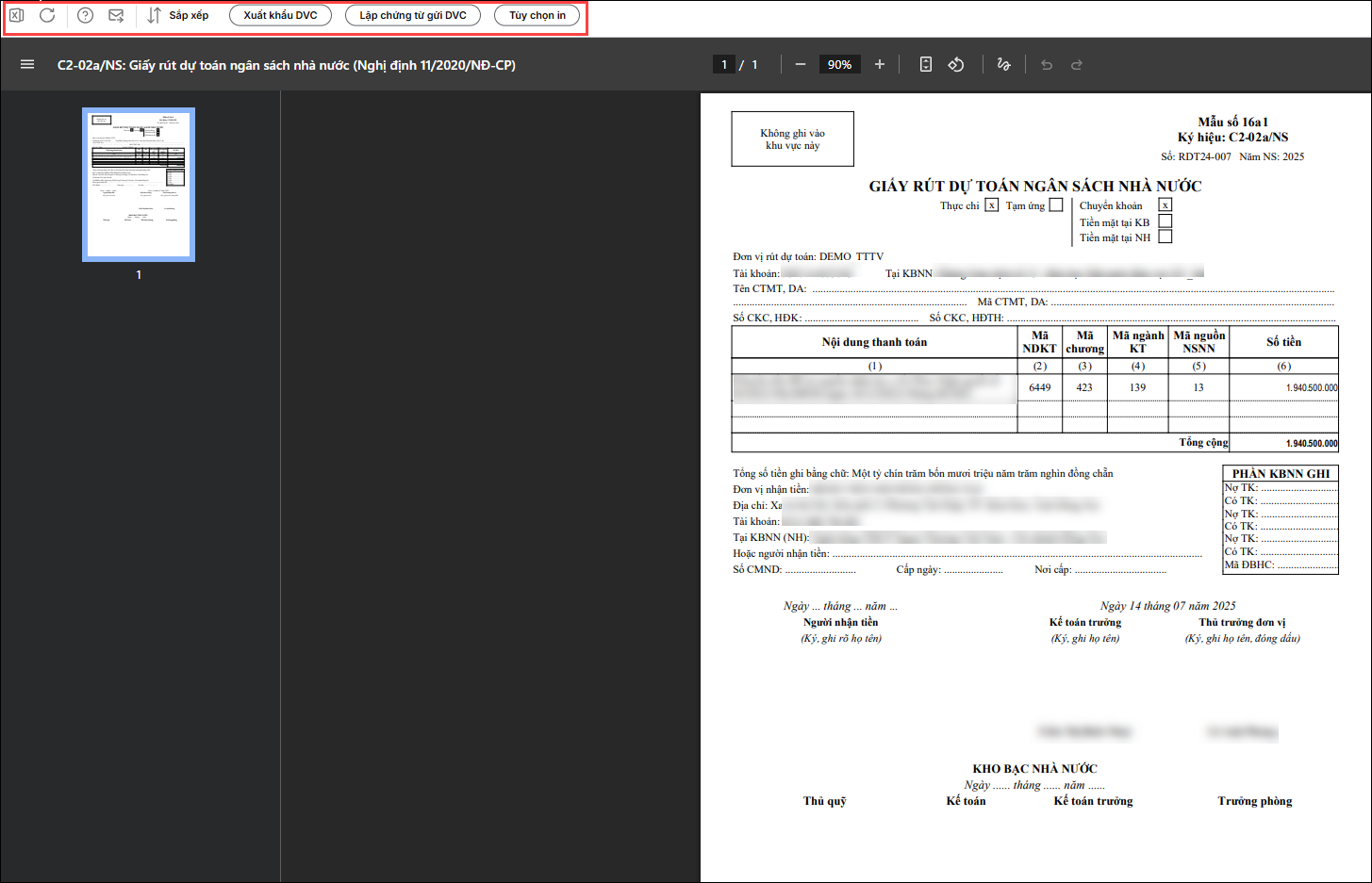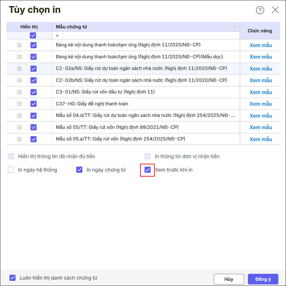 Bước 2: Tích chuột 1 lần vào mẫu đang cần xuất khẩu DVC. Ví dụ tích chuột vào C2-02a/NS: Giấy rút dự toán ngân sách Nghị định 347/2025 mẫu dọc và tích vào ô Xem trước khi in.