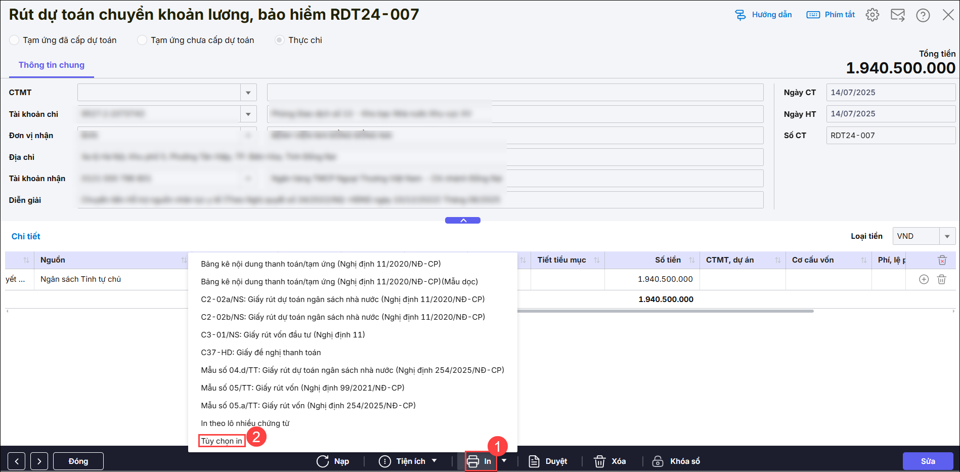 Bước 1: Anh/chị mở chứng từ tích vào In, lăn chuột xuống dưới chọn và tích Tùy chọn in.