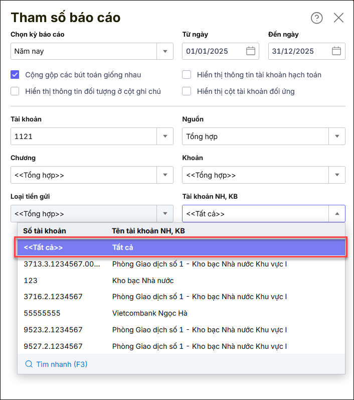 • Khi in sổ S12-H Sổ tiền gửi ngân hàng, kho bạc, chọn tham số Tài khoản NH, KB  <tất cả> để đối chiếu.
