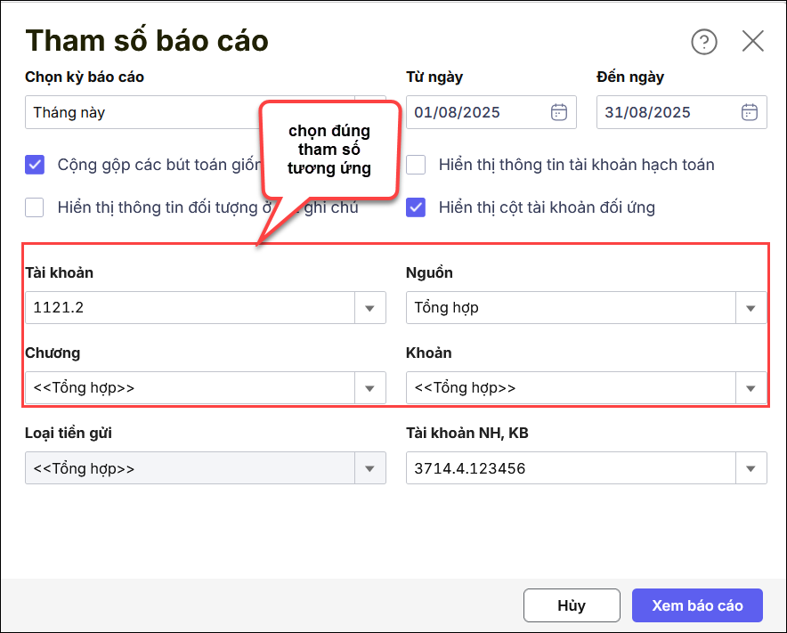 Giải pháp 1: Chọn đúng tham số khi in sổ tiền gửi