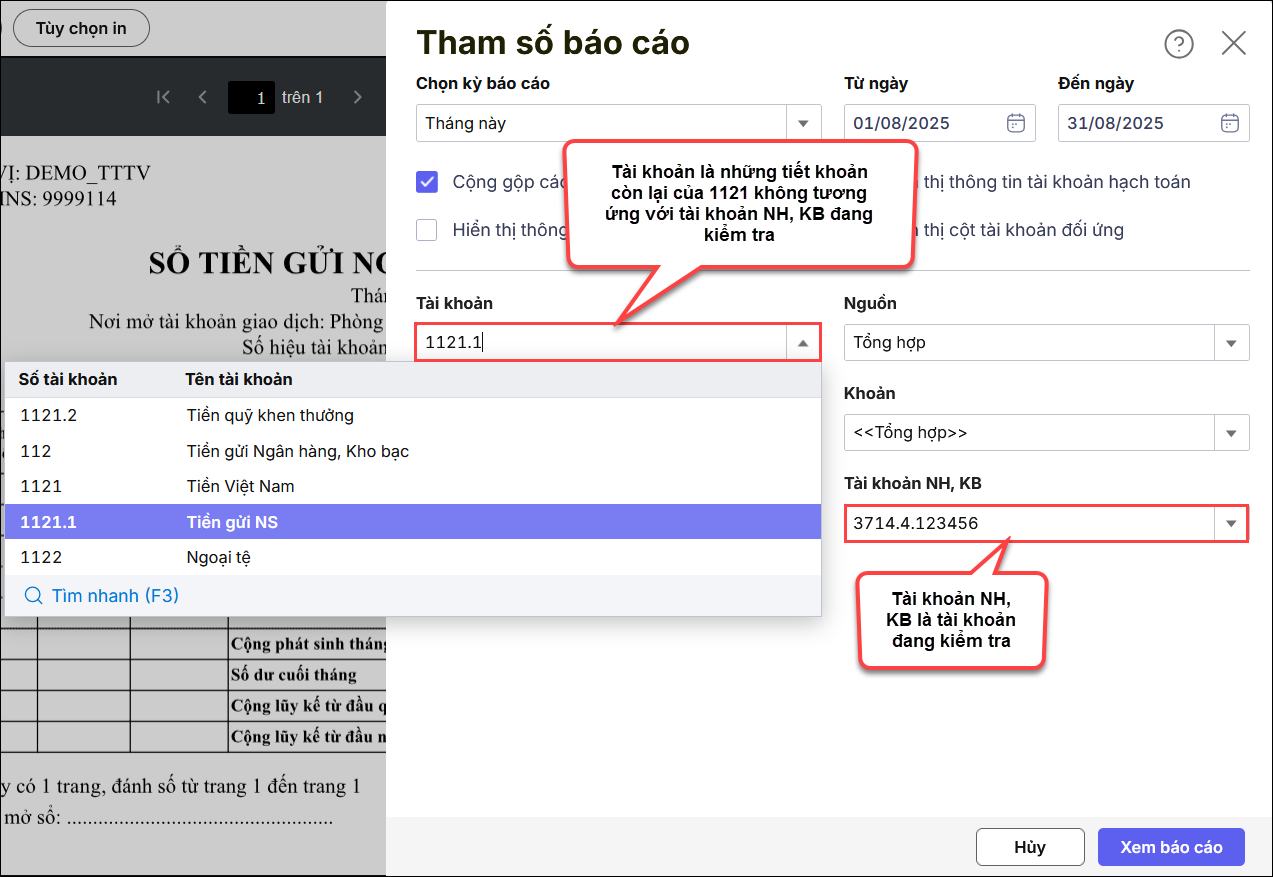 - Nếu tài khoản 1121 có tách tiết khoản thì chọn đúng tiết khoản con tương ứng với tài khoản đang kiểm tra, hoặc chọn tài khoản cha 1121