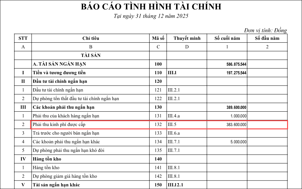 Chỉ tiêu Phải thu kinh phí được cấp (mã số 132) trên báo cáo B01/BCTC: Báo cáo tình hình tài chính sẽ lấy số liệu DNDK_TKNKP TK 135 nghĩa là Dư Nợ Cuối kỳ TK 135 chi tiết theo từng nguồn kinh phí. Nguồn nào Dư Nợ cuối kỳ 135 sẽ lên chỉ tiêu 132, nguồn nào dư có sẽ lên chỉ tiêu Các khoản nhận trước kinh phí được cấp (Mã số 253).
