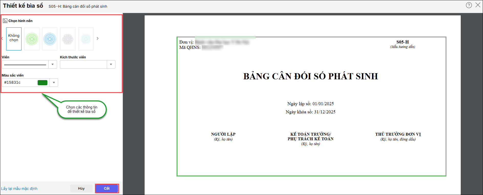 Lưu ý : Sau khi mở lại phần mềm vẫn hiển thị trang thiết kế bìa sổ anh/chị nhấn Cất nếu không có sự thay đổi thiết kế.
