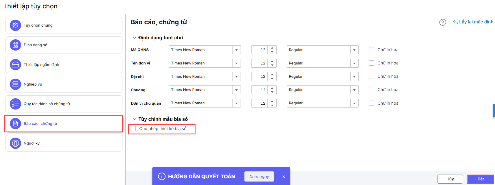 Bước 3: Bỏ ô Cho phép thiết kế bìa sổ. Nhấn Cất.