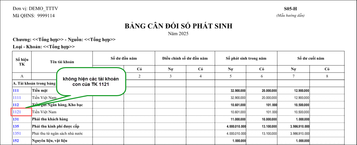 Ví dụ: Đơn vị có thêm các tài khoản con chi tiết của các tài khoản 1111, 1121, 3388, …. và có phát sinh các tài khoản này rồi nhưng khi xem báo cáo S05-H không thấy hiển thị các tài khoản con này, chỉ hiển thị các tài khoản mặc định theo hệ thống tài khoản của TT24/2024/TT-BTC