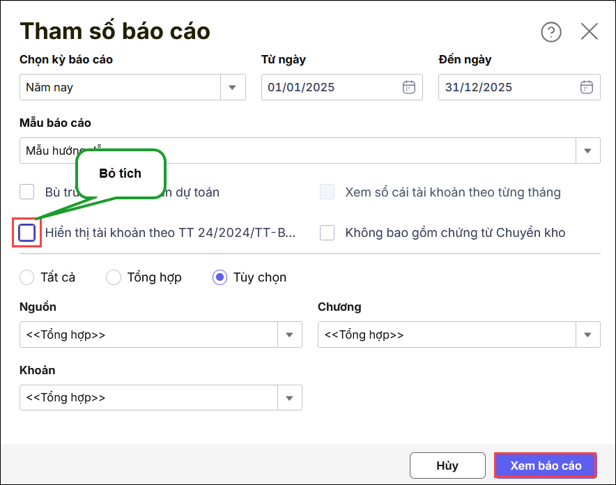 Anh/chị mở lại báo cáo, tại bảng tham số hiện ra, bỏ tích ô