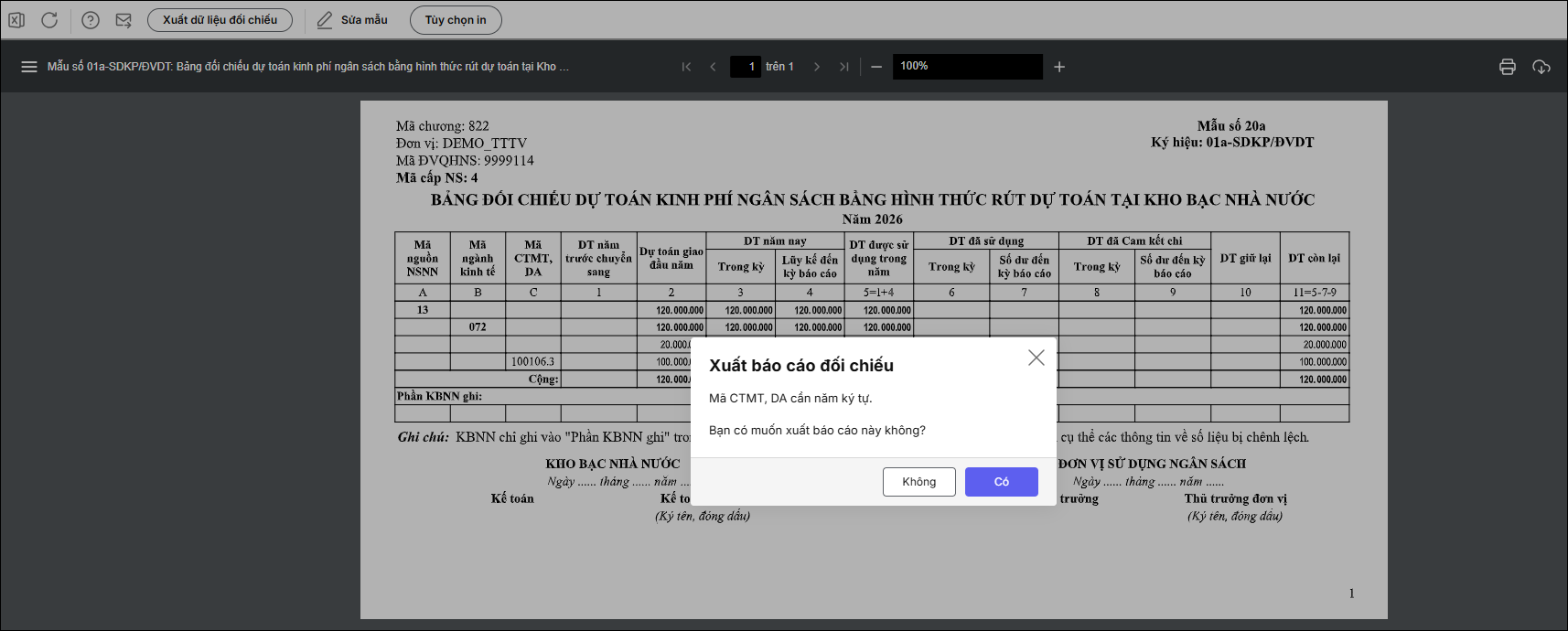 Bước 2: Khai báo tham số in báo cáo, lưu ý tích chọn Hiển thị mã CTMT, DA theo quy định