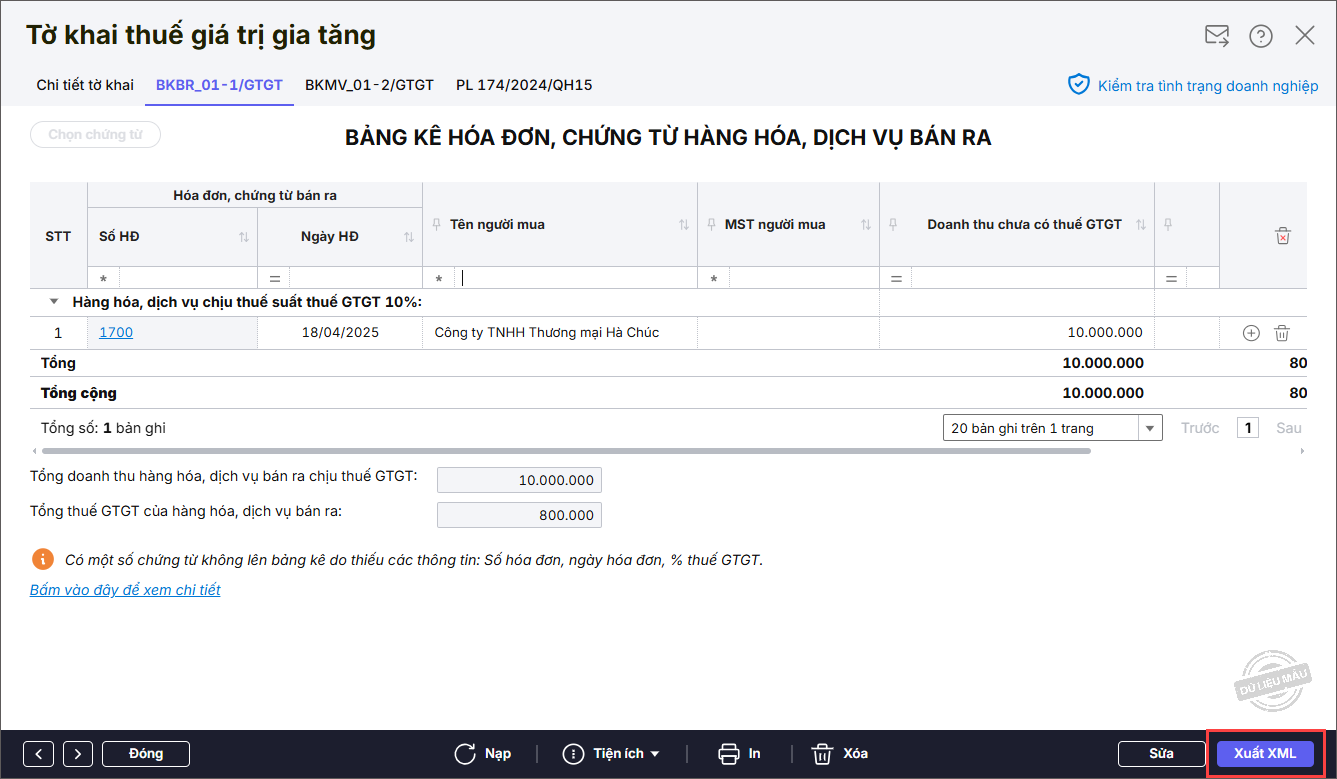 Bước 5: Nhấn In trên thanh công cụ để in bảng kê hoá đơn, chứng từ hàng hoá dịch vụ bán ra hoặc chức năng Xuất XML.