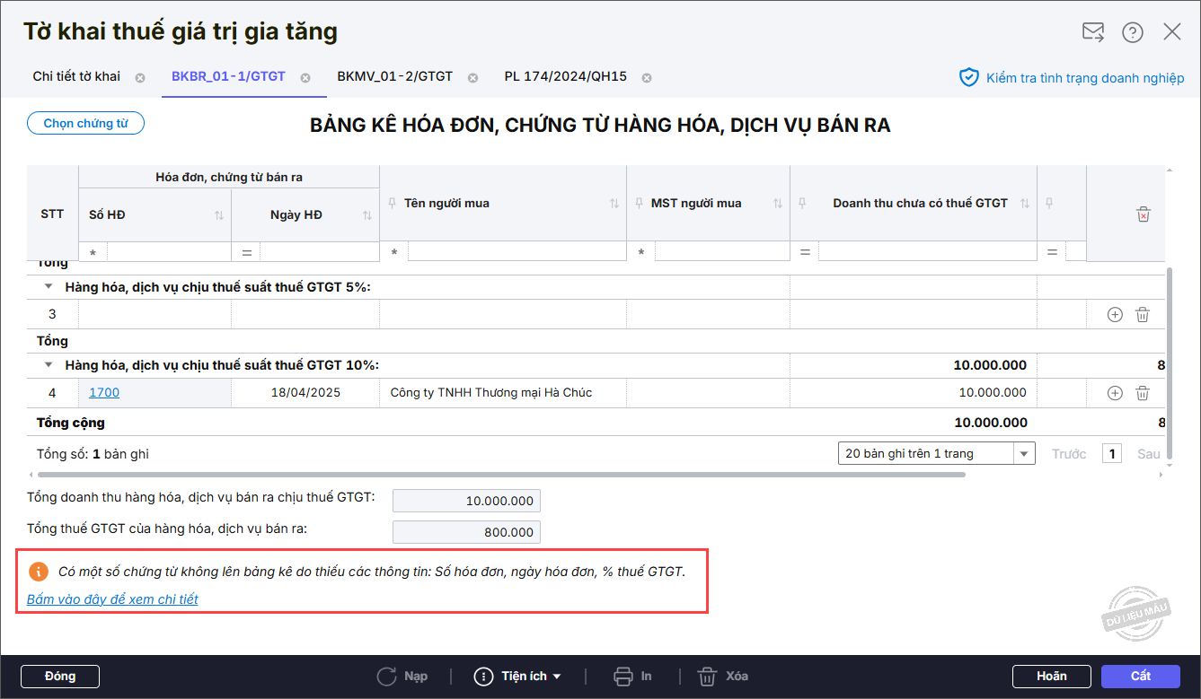 - Nếu cần xem các chứng từ không lên bảng kê do thiếu các thông tin: Số hóa đơn, Ngày hóa đơn, % thuế GTGT thì nhấn Bấm vào đây để xem chi tiết.
