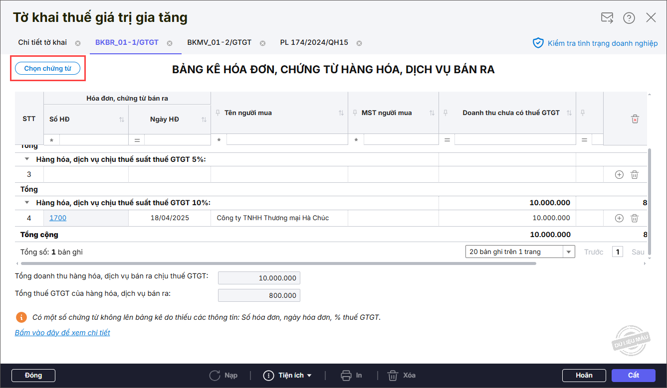 Bước 4: Phần mềm tự động lấy lên các chứng từ, hoá đơn bán ra trong kỳ ở tab BKBR_01-1/GTGT. Nếu cần bổ sung thêm chứng từ vào bảng kê thì nhấn Chọn chứng từ.
