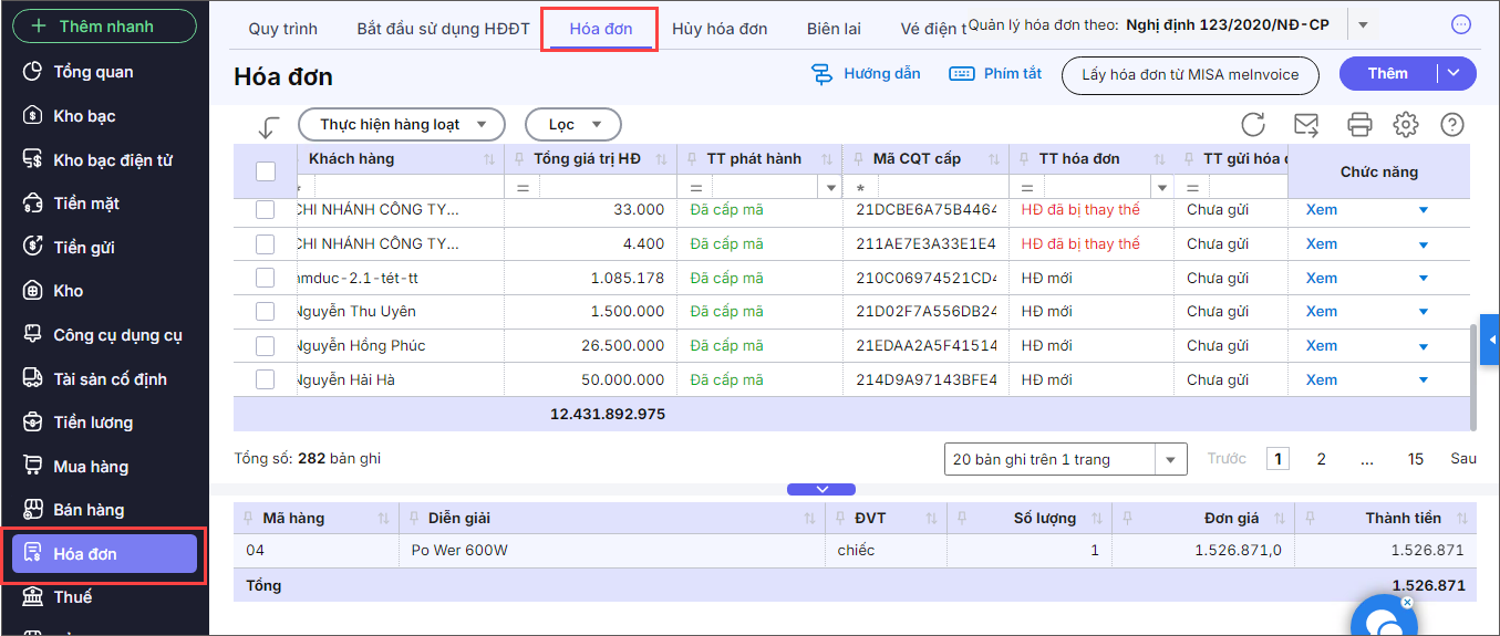 Bước 6: Có thể vào phân hệ Hóa đơn\mục Hóa đơn để xem các hóa đơn được tạo.
