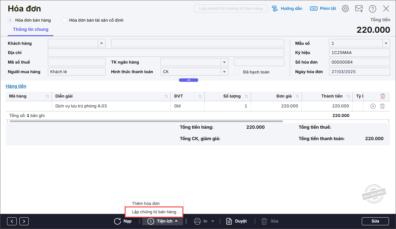 Bước 2: Mở hóa đơn đã lập lên nhấn vào mũi tên cạnh Tiện ích chọn Lập chứng từ bán hàng.