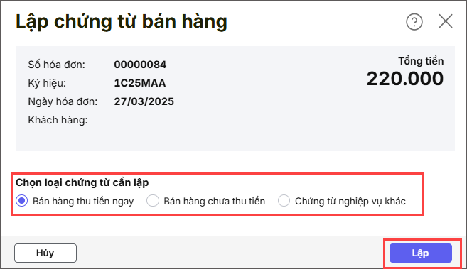 Bước 3: Chọn loại chứng từ cần lập là Bán hàng thu tiền ngay. Nhấn Lập.