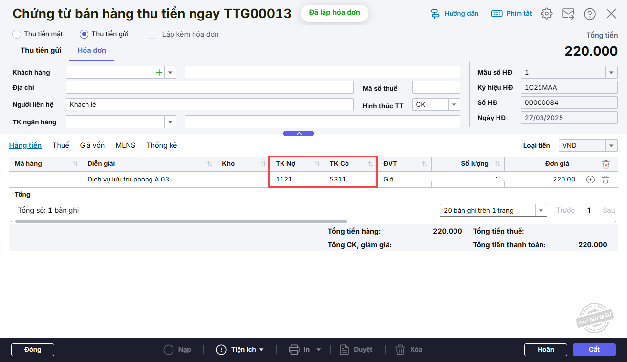 Bước 4: Phần mềm sinh chứng từ thu tiền gửi từ các thông tin trên hóa đơn, tự động hạch toán TK Nợ 1121, TK Có 5311 hoặc TK 711. Đồng thời ghi nhận TK thuế 33311.