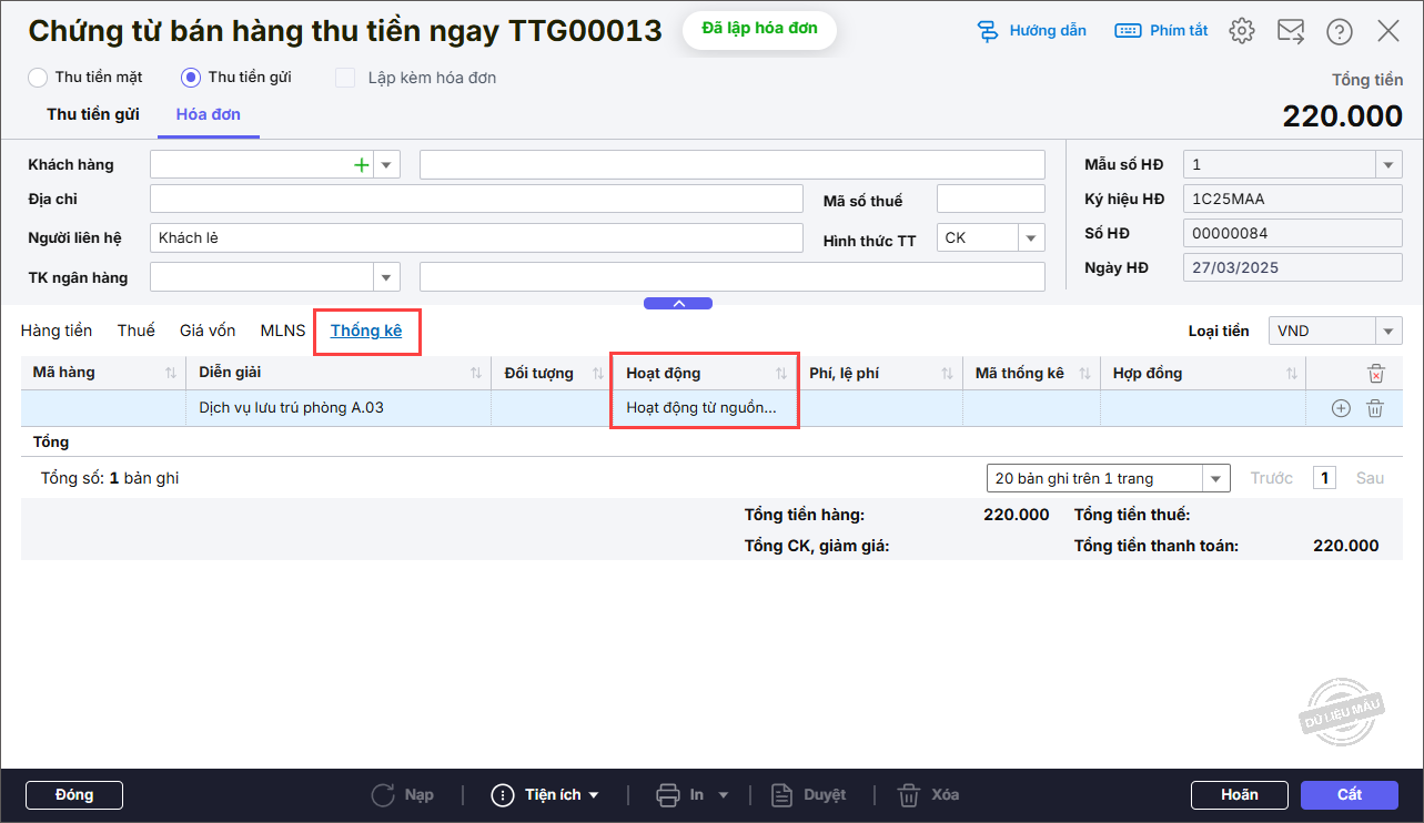 Bước 6: Khai báo Hoạt động tại tab Thống kê.