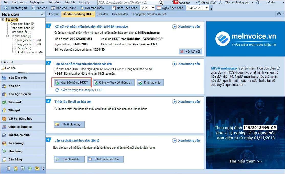 1. Chọn phân hệ Hóa đơn, chọn tab Bắt đầu sử dụng HĐĐT.