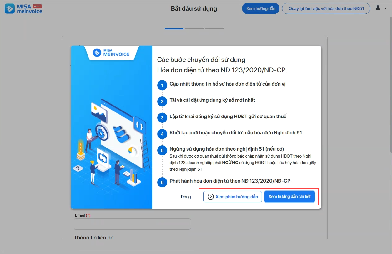 - Nhấn Xem phim hướng dẫn để xem video hướng dẫn các thao tác chuyển đổi sử dụng Hóa đơn điện tử theo NĐ 123/2020/NĐ-CP.