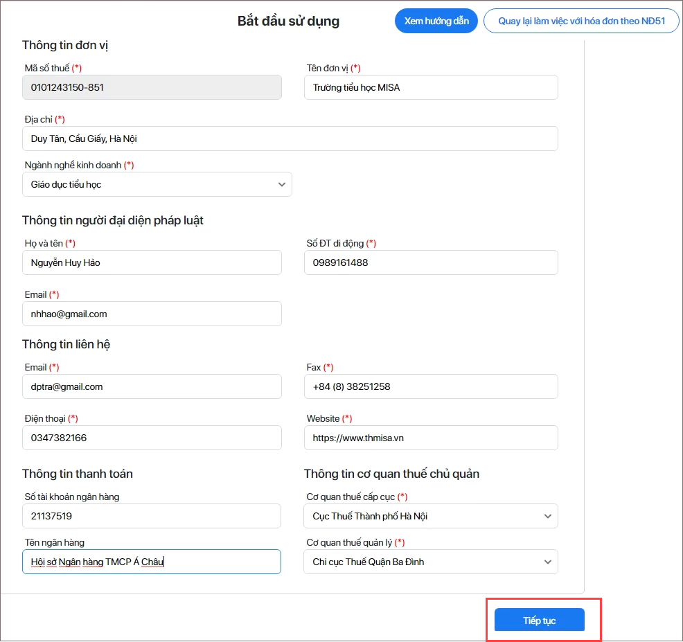 1. Khai báo Thông tin đơn vị và Thông tin người đại diện pháp luật.