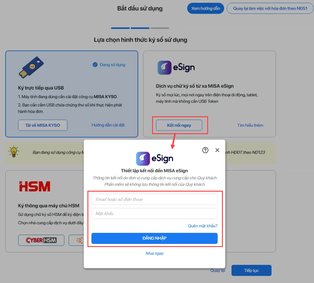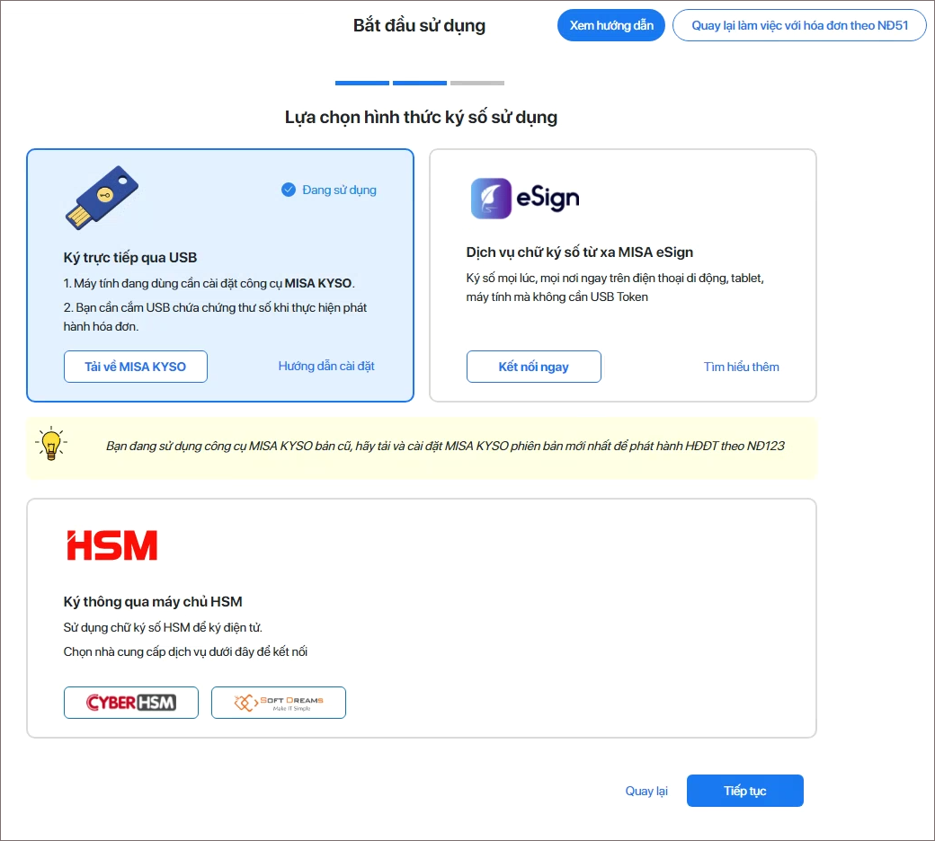 1. Anh/chị chọn hình thức ký số sử dụng qua USB/MISA eSign/HMS.
