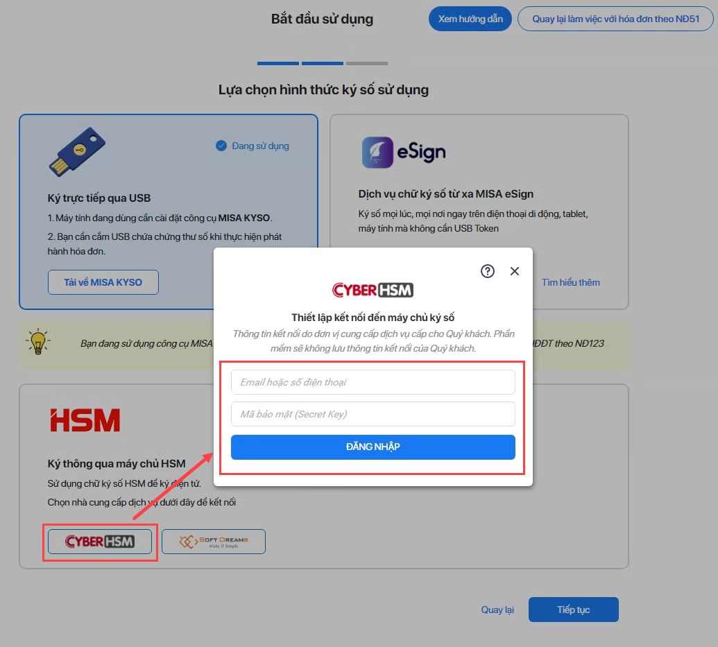 - Chọn nhà cung cấp dịch vụ là Cyber HSM hay Soft Dreams để kể nối.