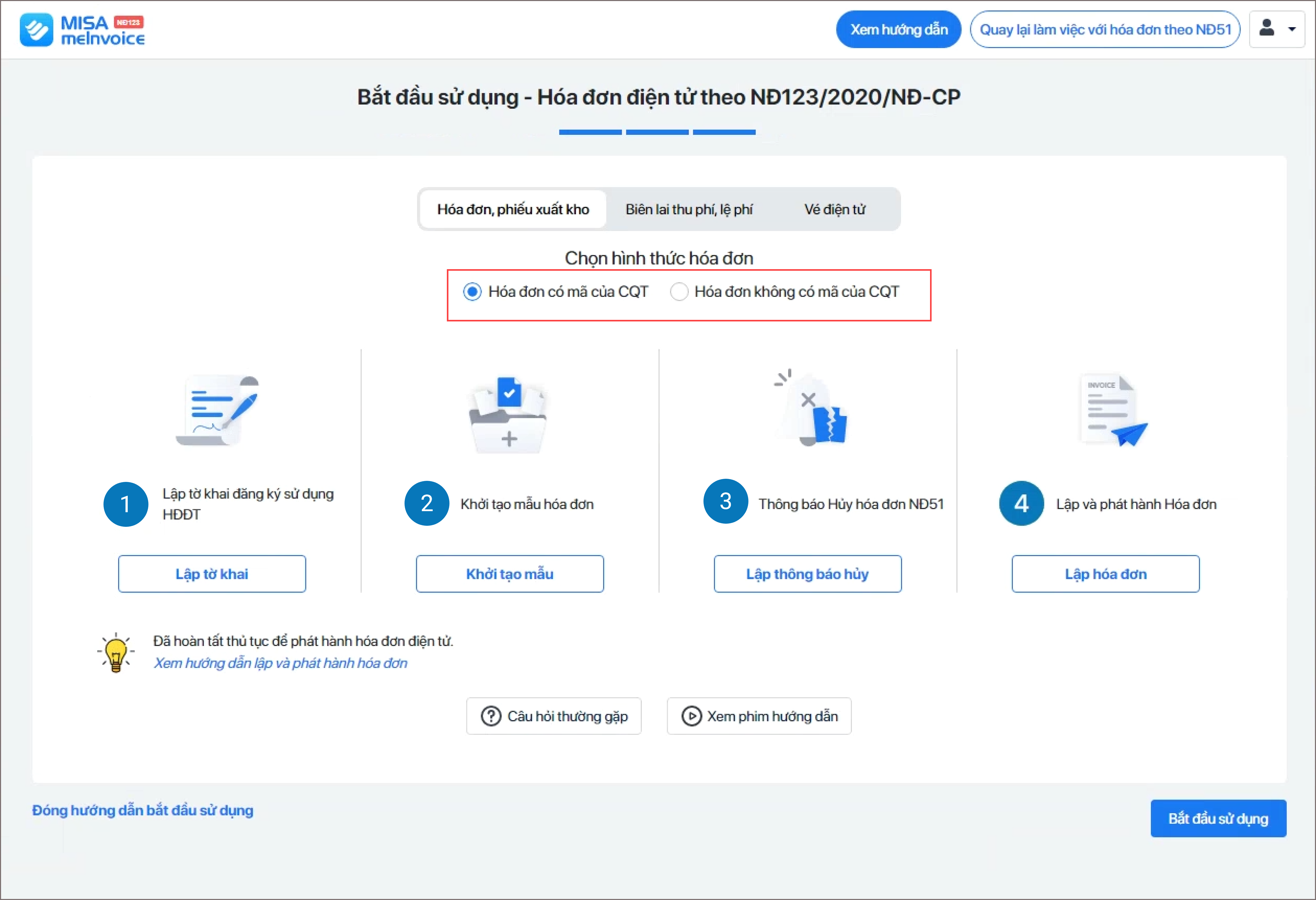 Chọn Hình thức hóa đơn là Hóa đơn có mã của CQT hay là Hóa đơn không có mã của CQT.