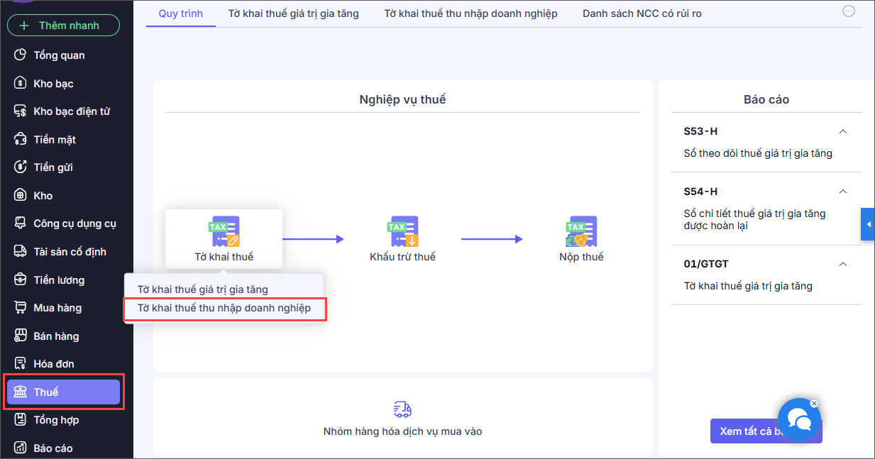 Bước 1: Vào phân hệ Thuế, chọn Tờ khai thuế\Tờ khai thuế thu nhập doanh nghiệp.