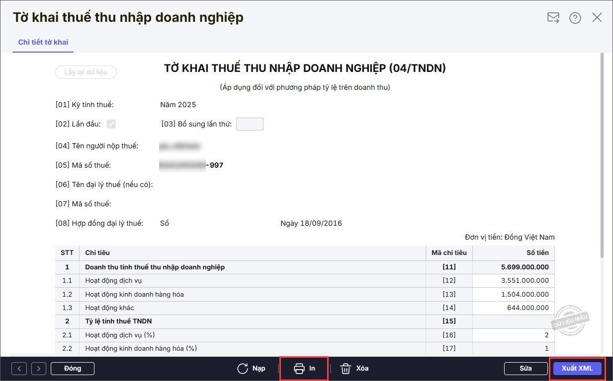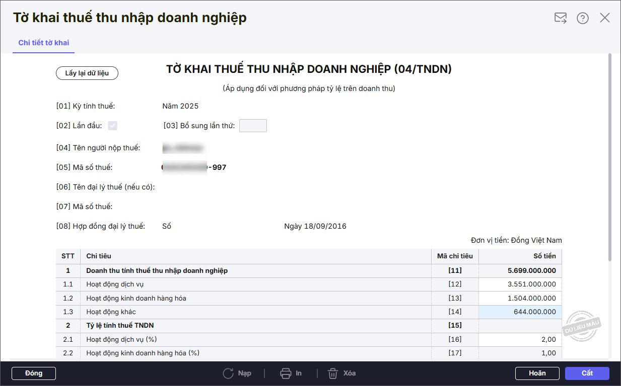 Lưu ý: Phần mềm mới hỗ trợ mẫu mẫu 04/TNDN theo TT80/2021 áp dụng đối với phương pháp tỷ lệ trên doanh thu