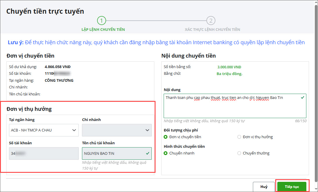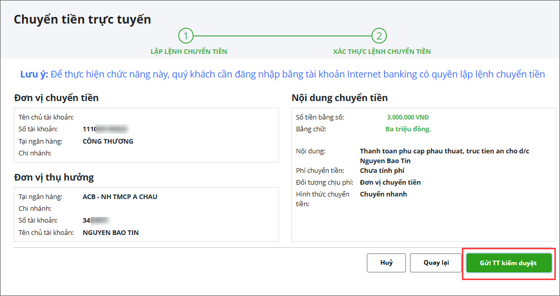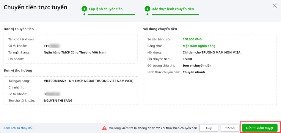 Phạm vi áp dụng: Kế toán viên được phân quyền Chuyển tiền trực tuyến, kế toán trưởng được phân quyền Kiểm duyệt và Chuyển tiền trực tuyến (trong trường hợp kế toán trưởng là người lập lệnh chuyển tiền) trên phân hệ Ngân hàng điện tử (Xem hướng dẫn phân quyền tại đây).