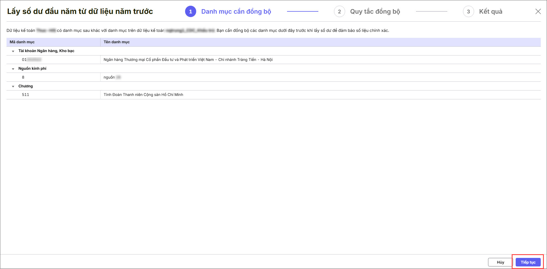 - Kiểm tra các danh mục cần đồng bộ hệ thống đã lấy lên. Nhấn Tiếp tục.