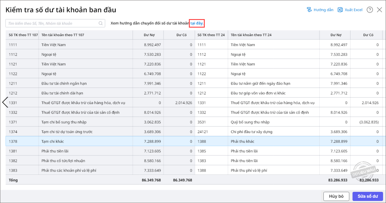 Trường hợp cần xem Hướng dẫn chuyển đổi số dư tài khoản của Bộ tài chính, nhấn vào “tại đây” (màu xanh).