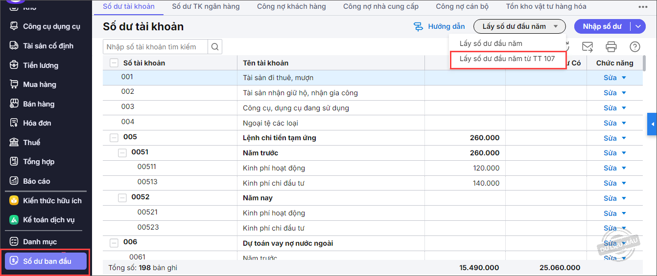 Bước 2: Tại tab Số dư tài khoản, nhấn Lấy số dư đầu năm\Lấy số dư đầu năm từ TT107.