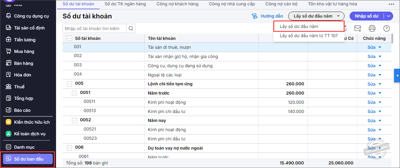 Bước 2: Vào tab Số dư tài khoản, nhấn Lấy số dư đầu năm\Lấy số dư đầu năm.