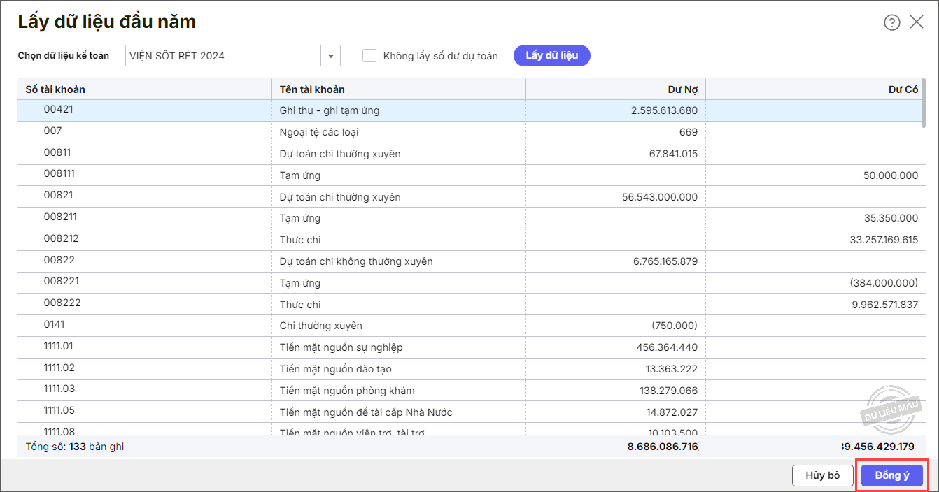 Bước 6: Sau khi hệ thống hiển thị số dư từ dữ liệu cũ, nhấn Đồng ý để hệ thống thực hiện cập nhật số dư của dữ liệu cũ sang dữ liệu hiện tại.