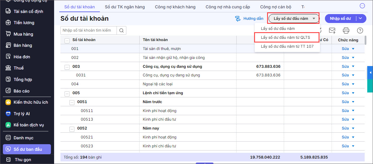 Bước 2: Tại tab Số dư tài khoản, nhấn Lấy số dư đầu năm\Lấy số dư đầu năm từ QLTS.