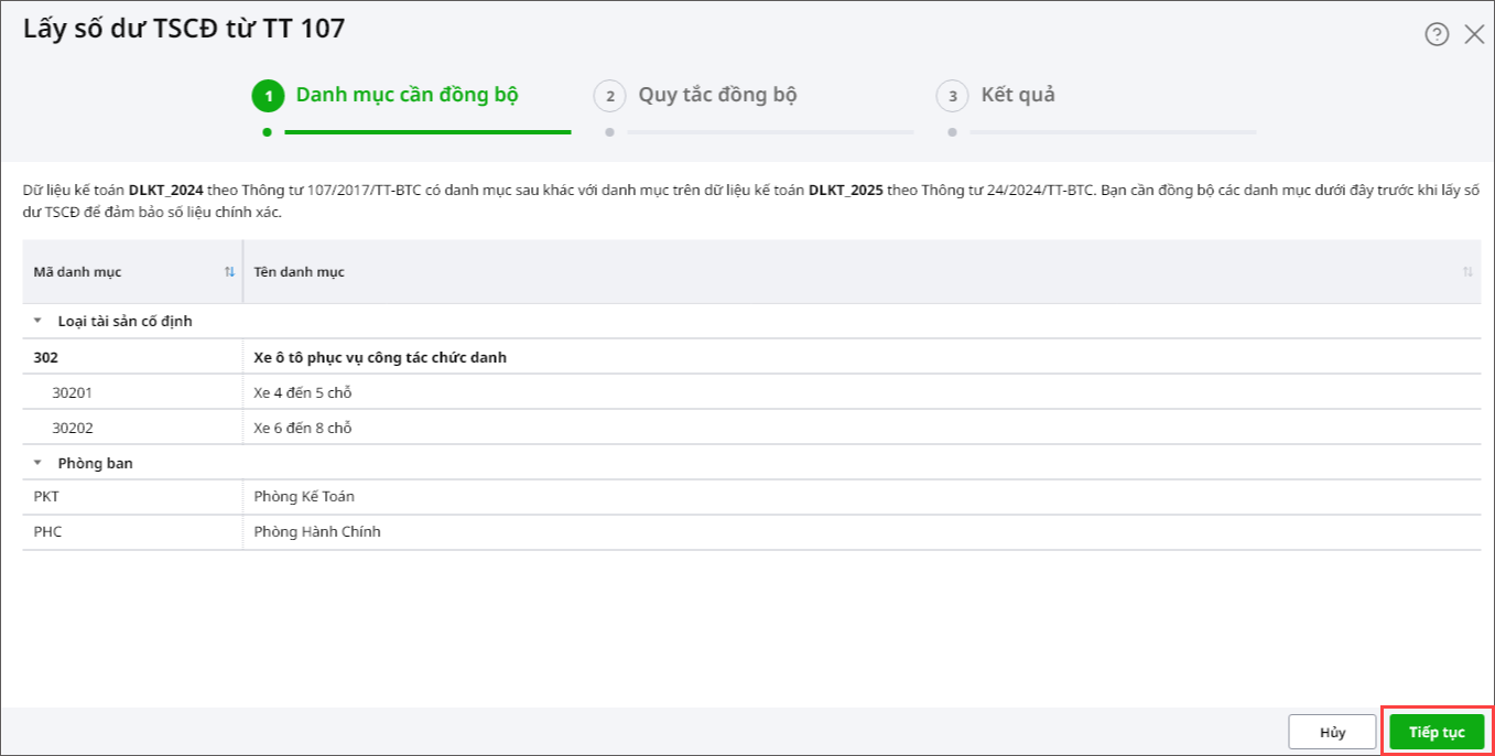 Bước 5: Nếu có chênh lệch danh mục trên dữ liệu theo TT107 với dữ liệu theo TT24, đơn vị cần thực hiện đồng bộ danh mục bằng cách nhấn Tiếp tục.