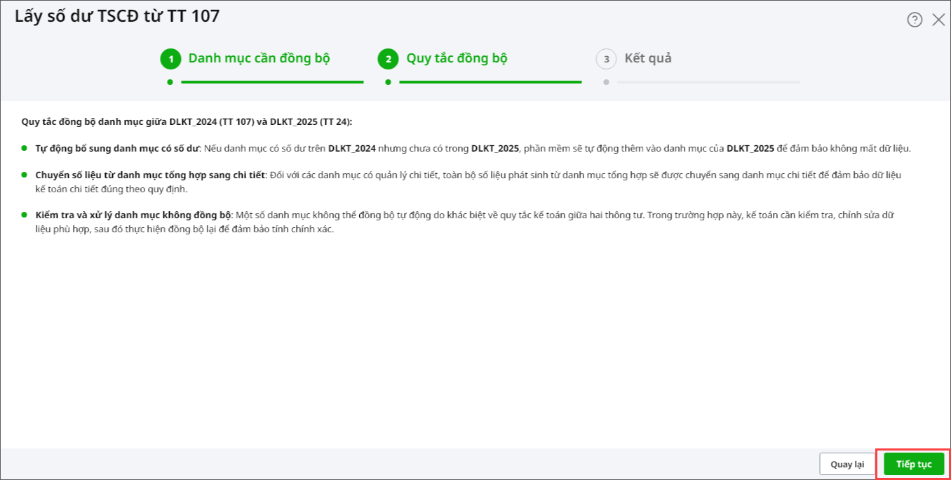 Bước 6: Xem quy tắc đồng bộ danh mục và nhấn Tiếp tục.