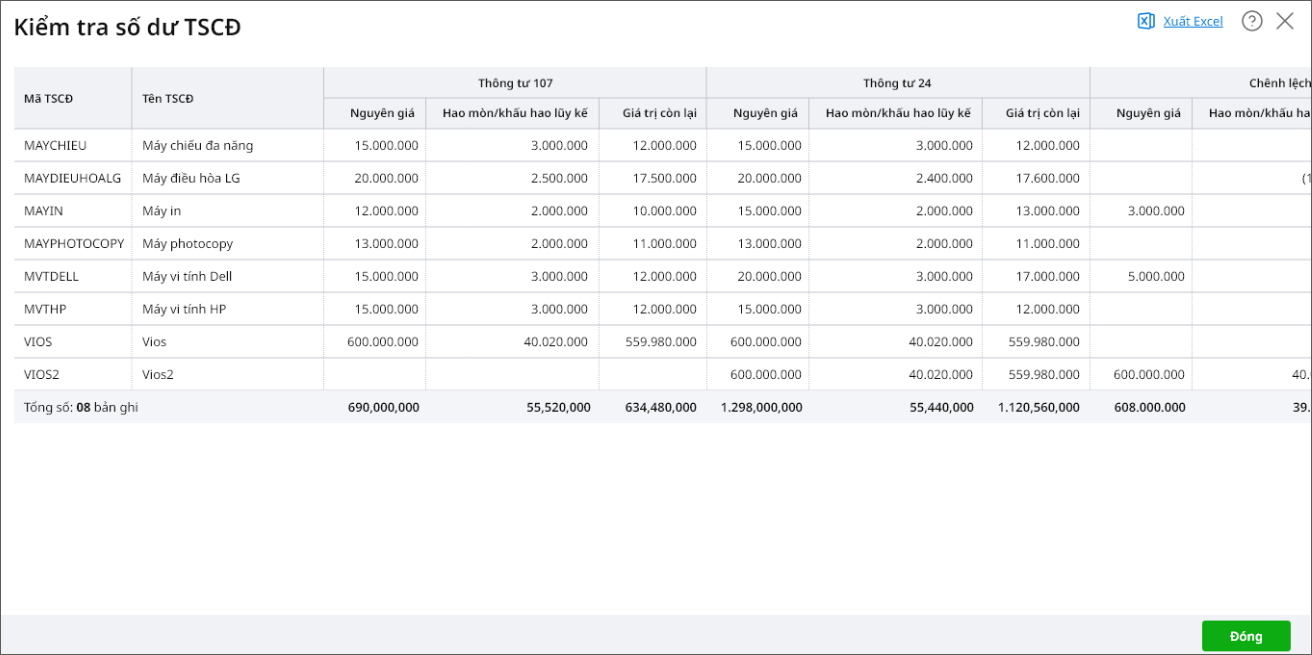 – Hiện nay: Phần mềm đáp ứng cho đơn vị có thể lấy được số dư chi tiết cho từng danh mục TSCĐ kèm giá trị nguyên giá, hao mòn, khấu hao lũy kế mới tương ứng, ngay cả trong trường hợp danh mục TCSĐ có sự khác biệt giữa 2 dữ liệu.