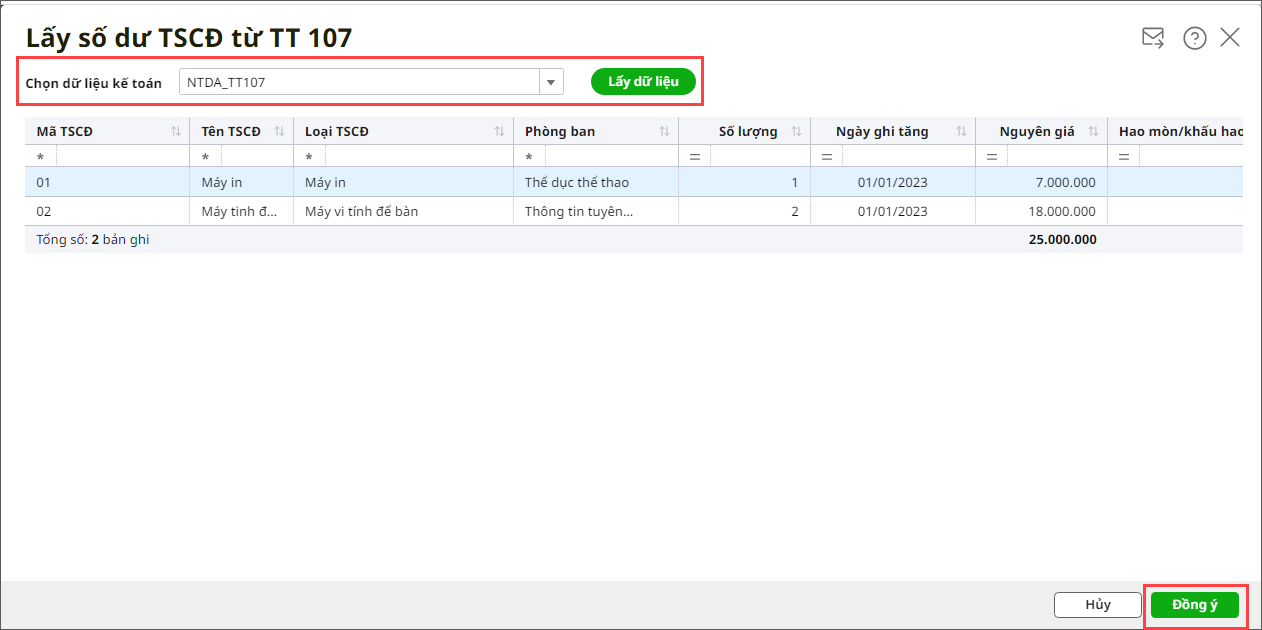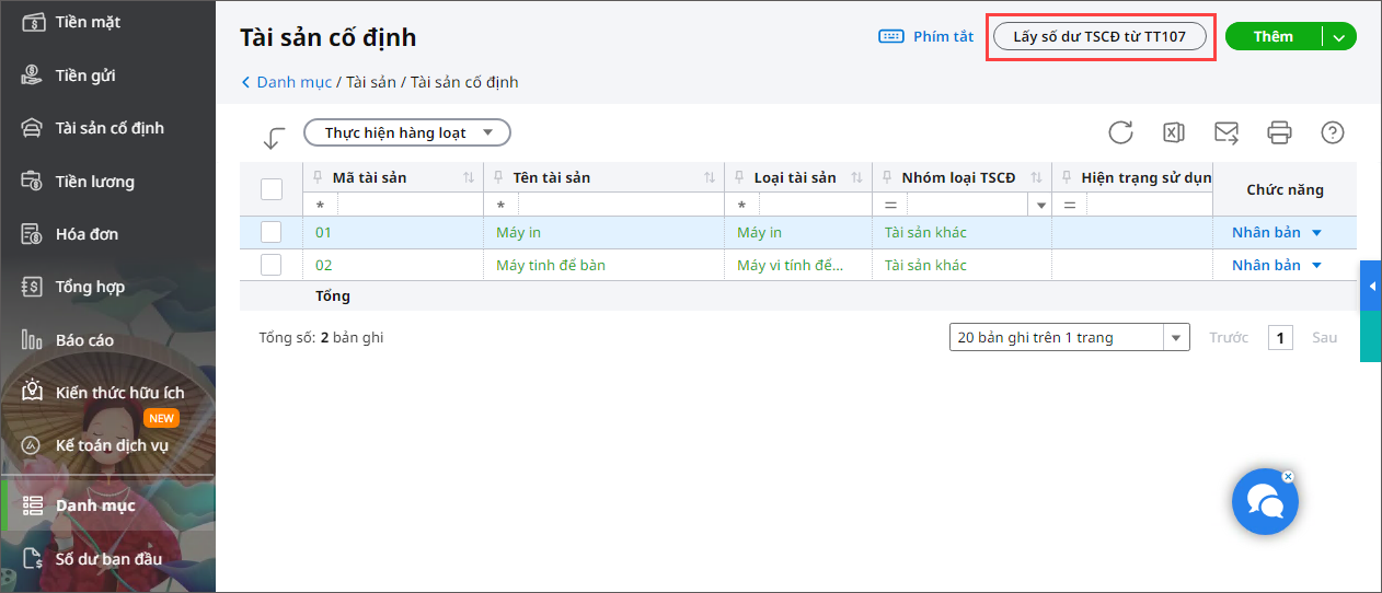 Bước 2: Nhấn Lấy số dư TSCĐ từ TT107.