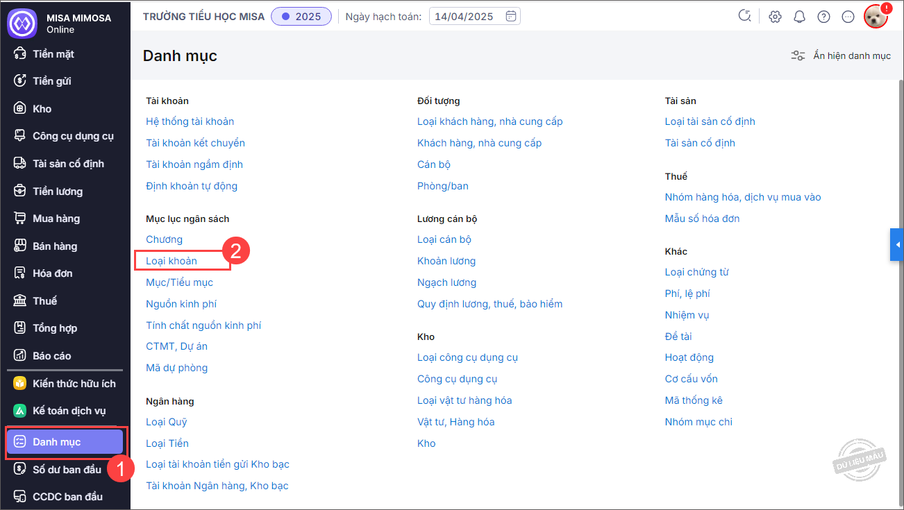 Bước 1: Chọn menu Danh mục/Loại khoản.