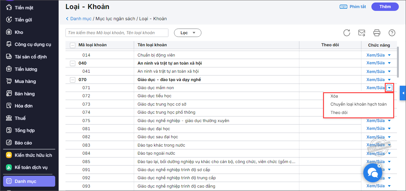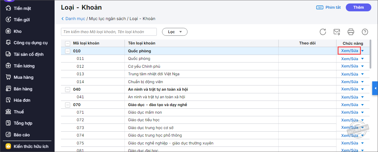 Bước 3: Tích đúp hoặc nhấn Xem/Sửa tại dòng Loại khoản cần sửa.
